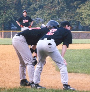 Dave Vadurro (left) discusses base running options from third base with Bill Kohut